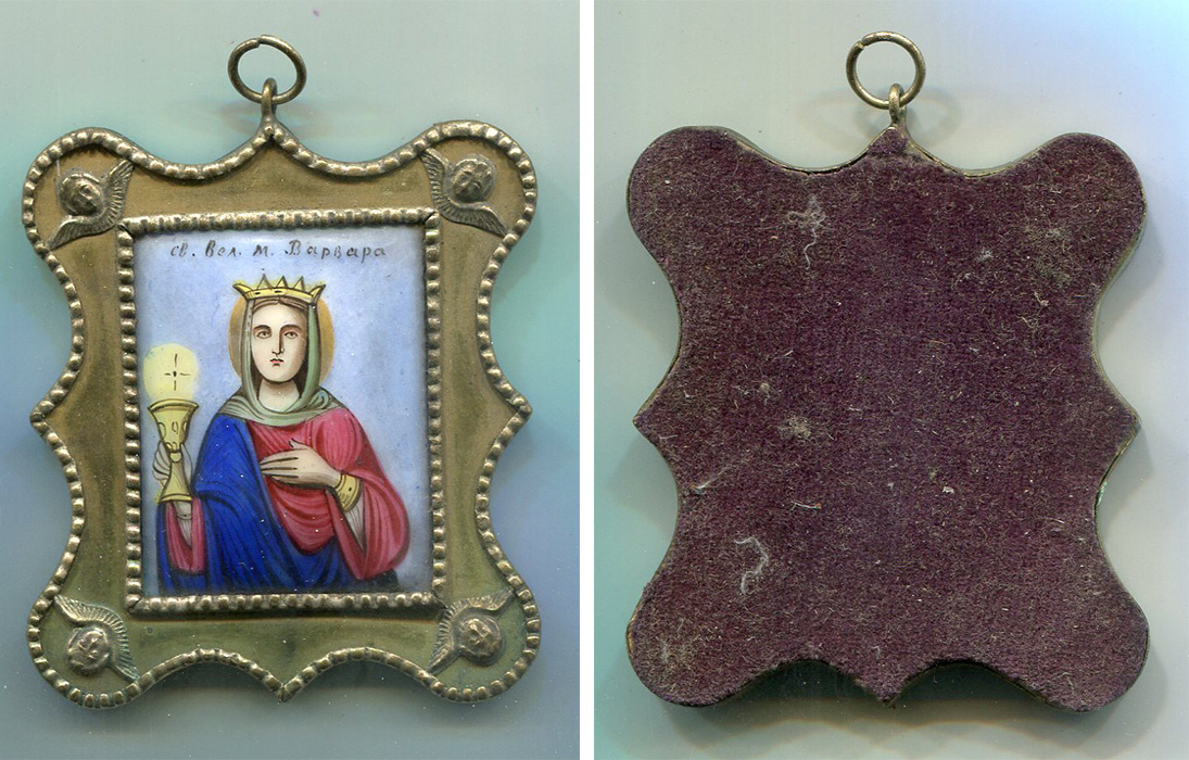 Антикварная иконка Святая Великомученица Варвара. Ростовская финифть, 19 век