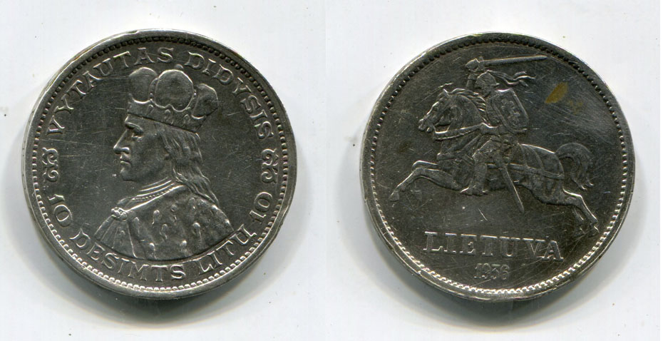Монета серебро 10 лит 1936 года. Литовская Республика