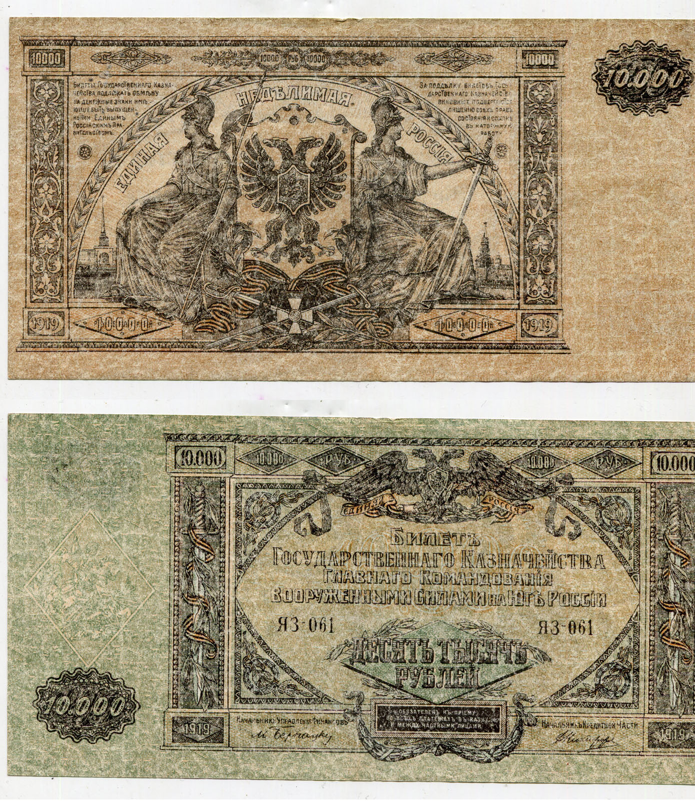 Билет 10000 рублей 1919 года. Государственное Казначейство Главного Командования Вооруженными силами на Юге России