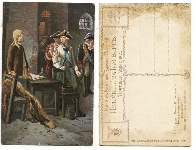 Почтовая карточка, Е. Буров, Петр III посещает Иоанна Антоновича. Издание Акц. об-ва Гранберг