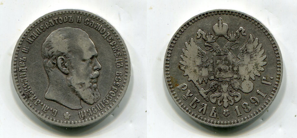 Монета серебряная 1 рубль 1891 года . Император Всероссийский Александр III
