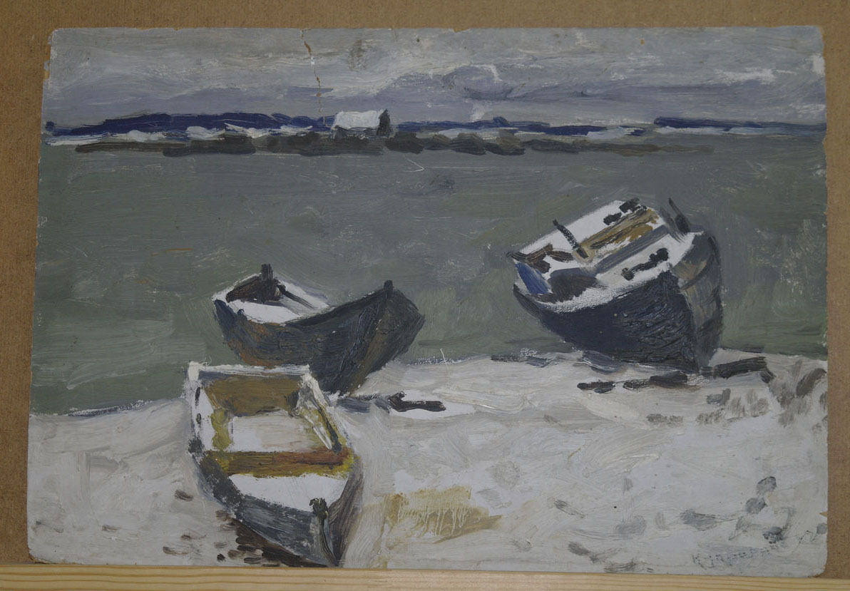 Картина маслом картон Азовское море. Рыбацкие лодки на берегу. Автор Куприянов М.В.