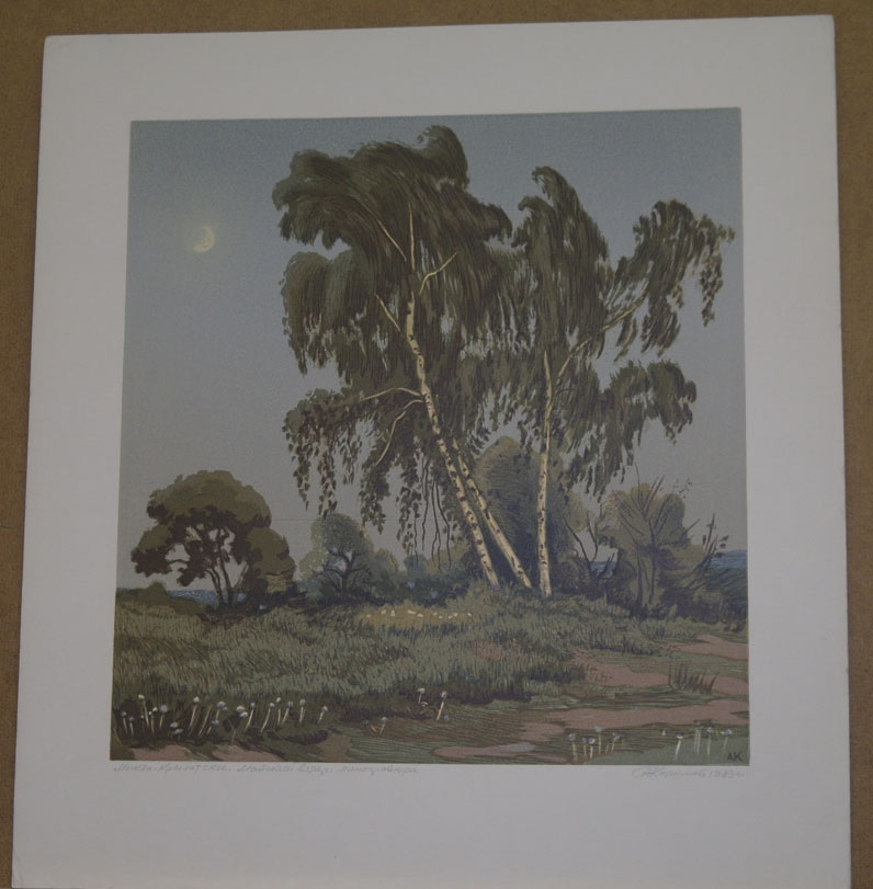 Цветная линогравюра "Майский вечер" Москва- Крылатское". Художник-график Каримов А.Н. , 1983