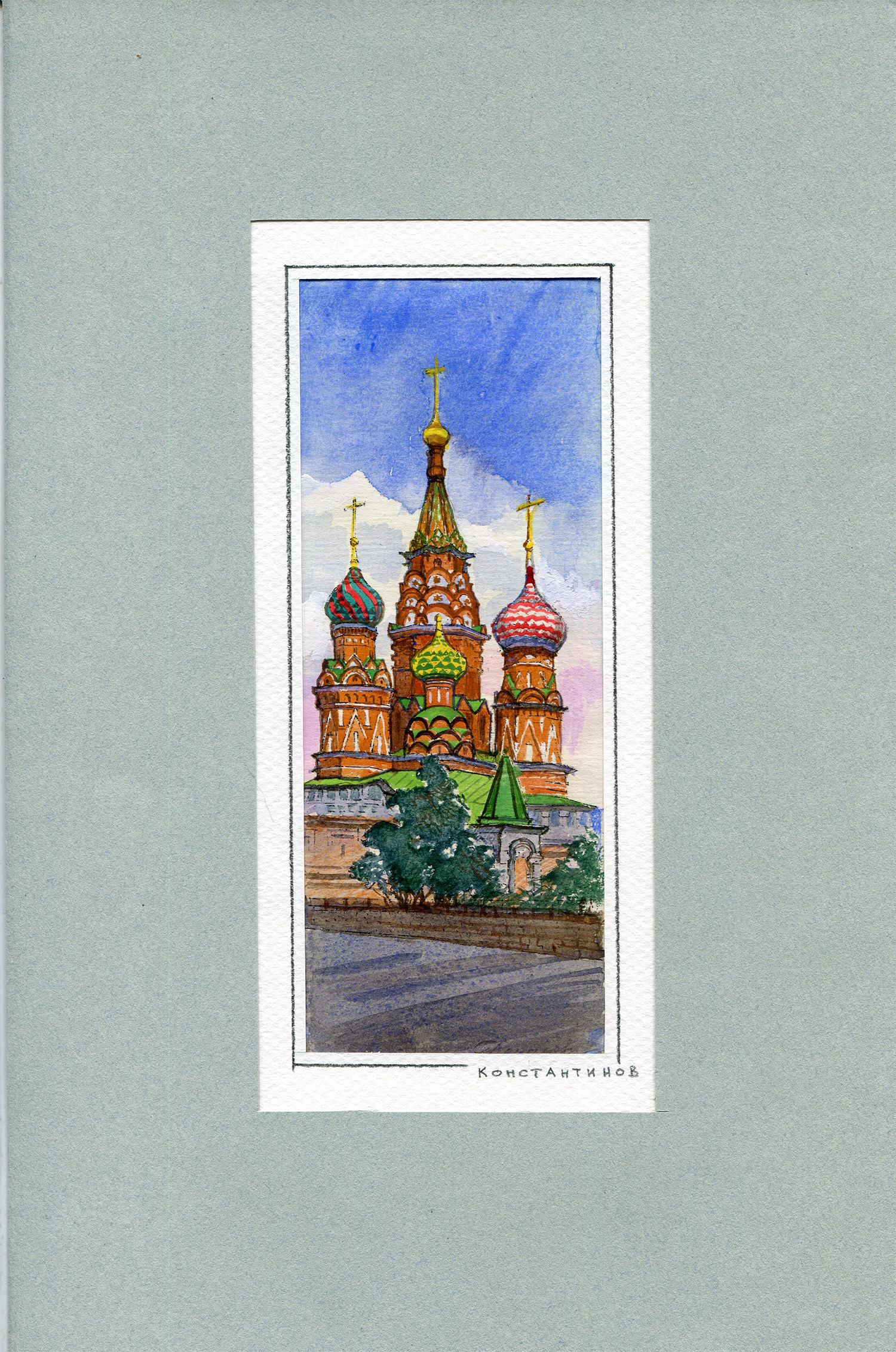 Картина акварелью "Храм Василия Блаженного в Москве". Константинов,1970-е годы
